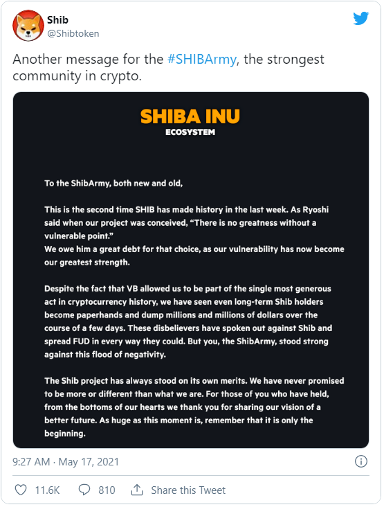비탈릭 부테릭 비탈릭 부테릭 이 Shibainu coin을 소각한후 Shibainu 회사에서 트위터로통해 발행한 Statement 입니다. 비탈릭 부테릭 한테 찬사를 하는 내용을 서술하였네요... 이로써 SHIB의 가치가 놓아질수 있고 시장이 더욱 활성화 되므로써 할수도있다는 내용같네요.